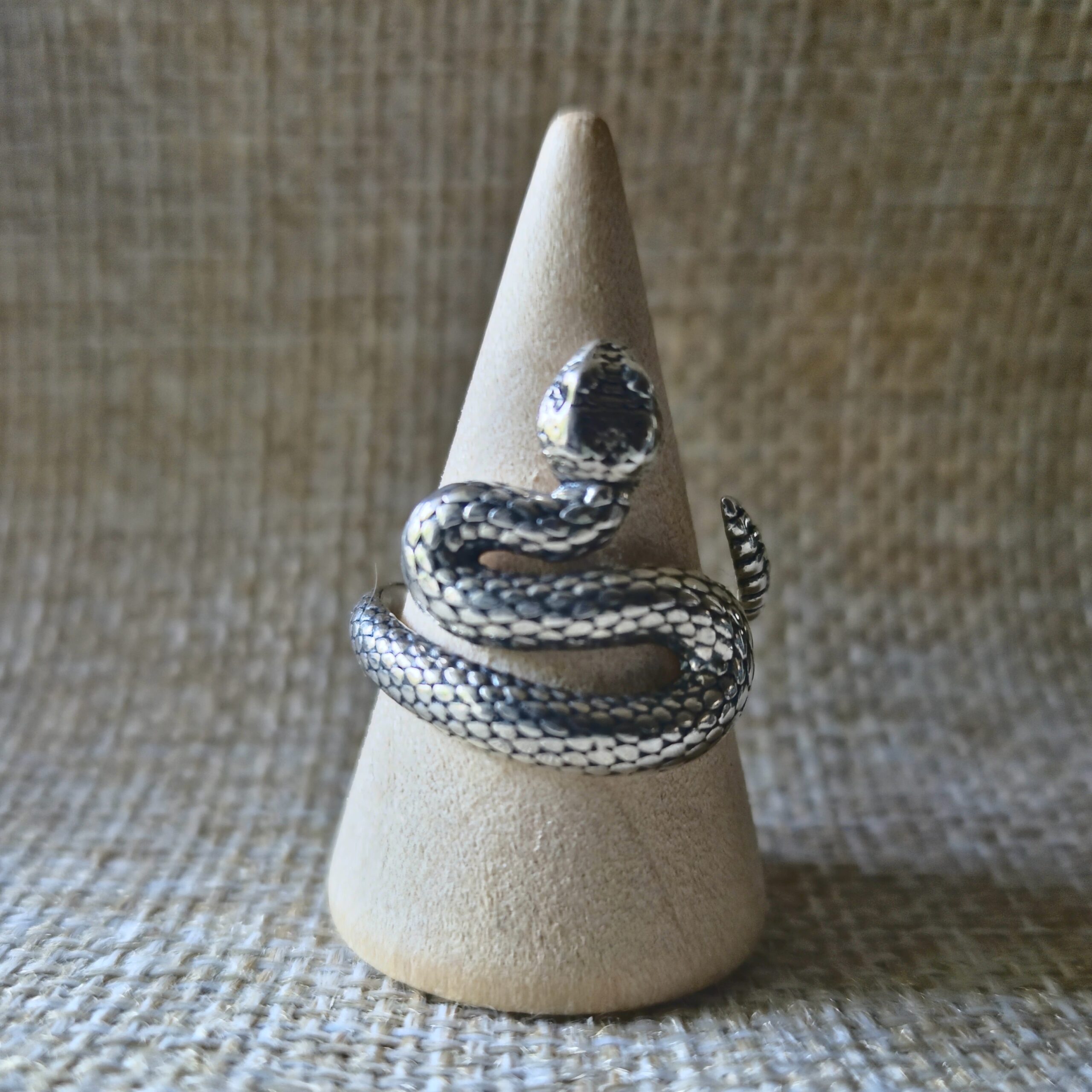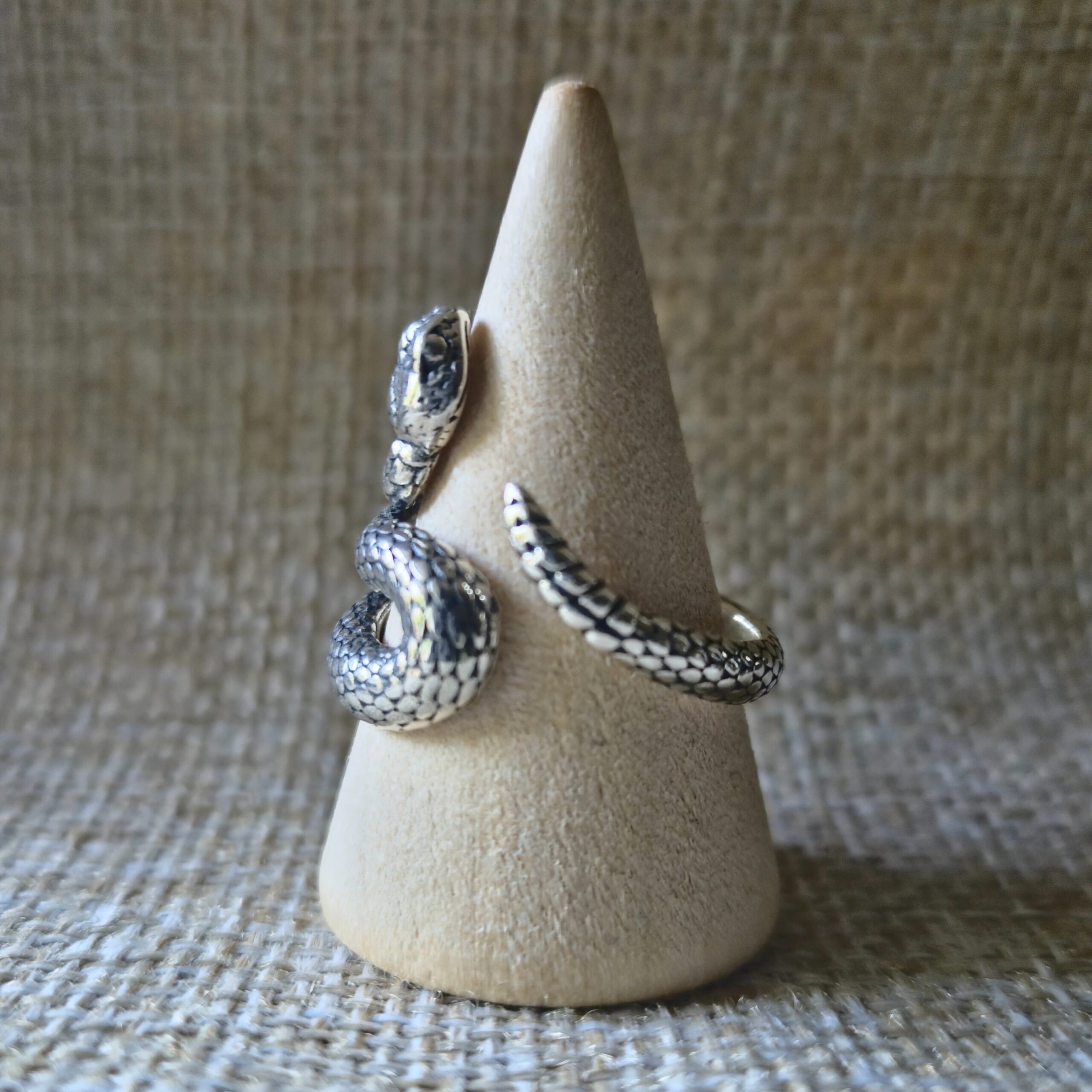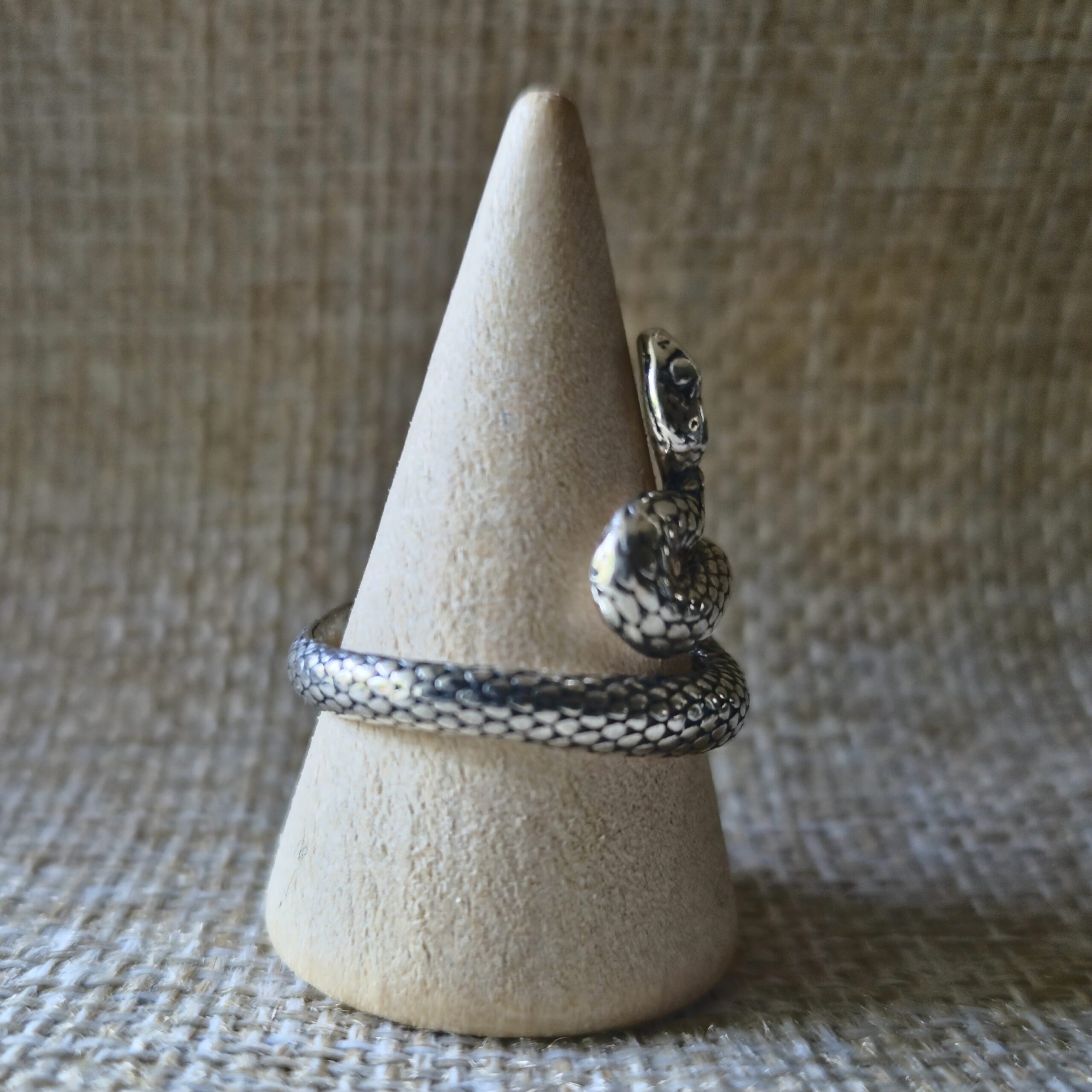 Zilveren slang als open setting. De ring heeft een s925 zilver laag en is beperkt verstelbaar in maat. Voor een maatcheck, neem even contact op of bezoek mijn Tiktok live zodat ik je kan laten zien met welke maat deze ring goed past.