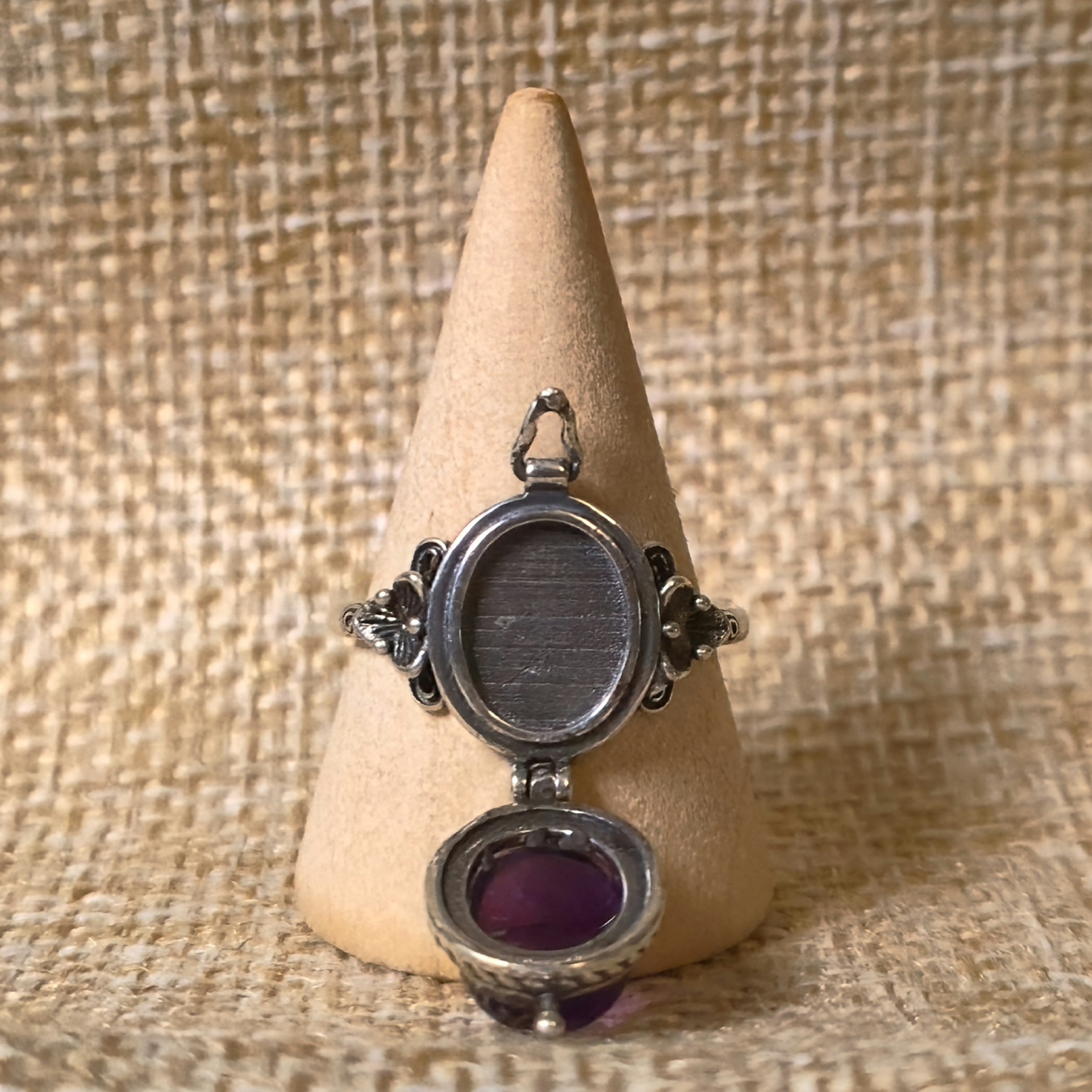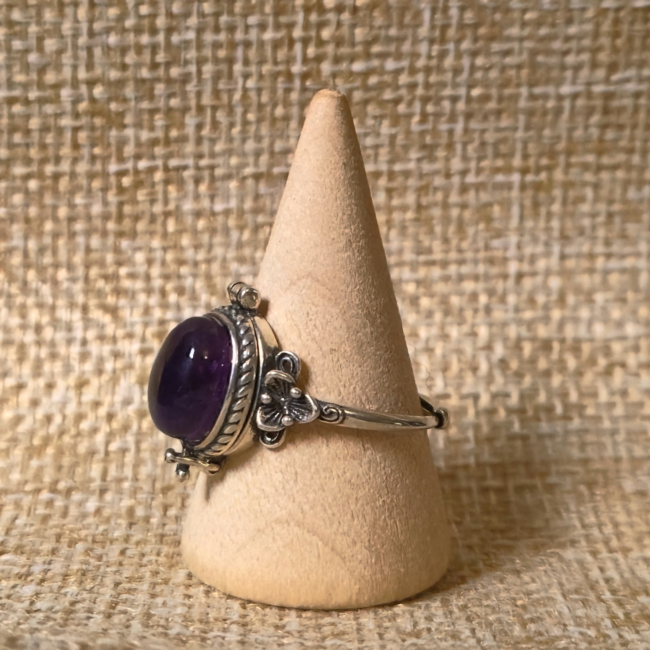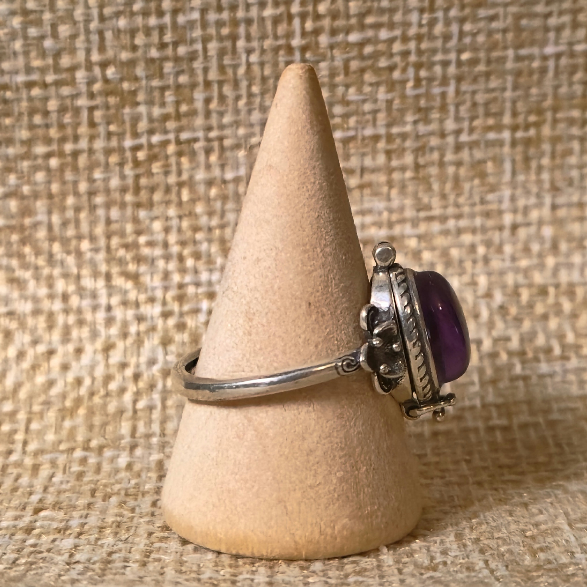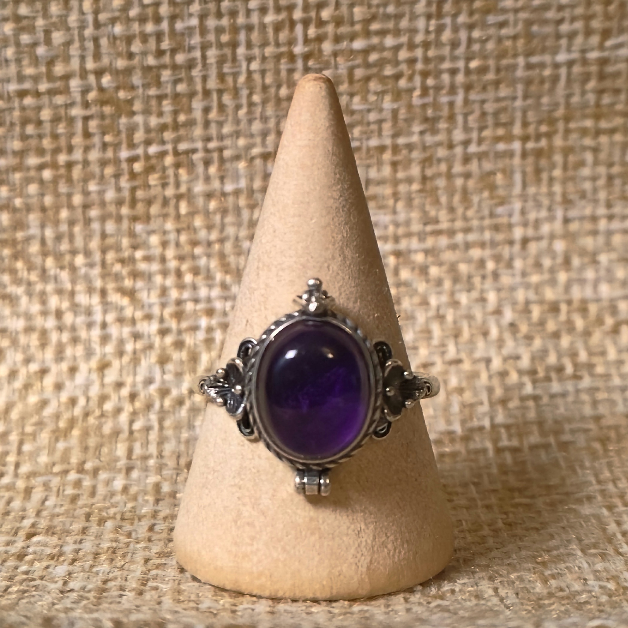 De zogeheten poison ring met amethist steen. Kan open en dicht gemaakt worden, maar sealt niet af. De ring is van zilver en verstelbaar in maat.