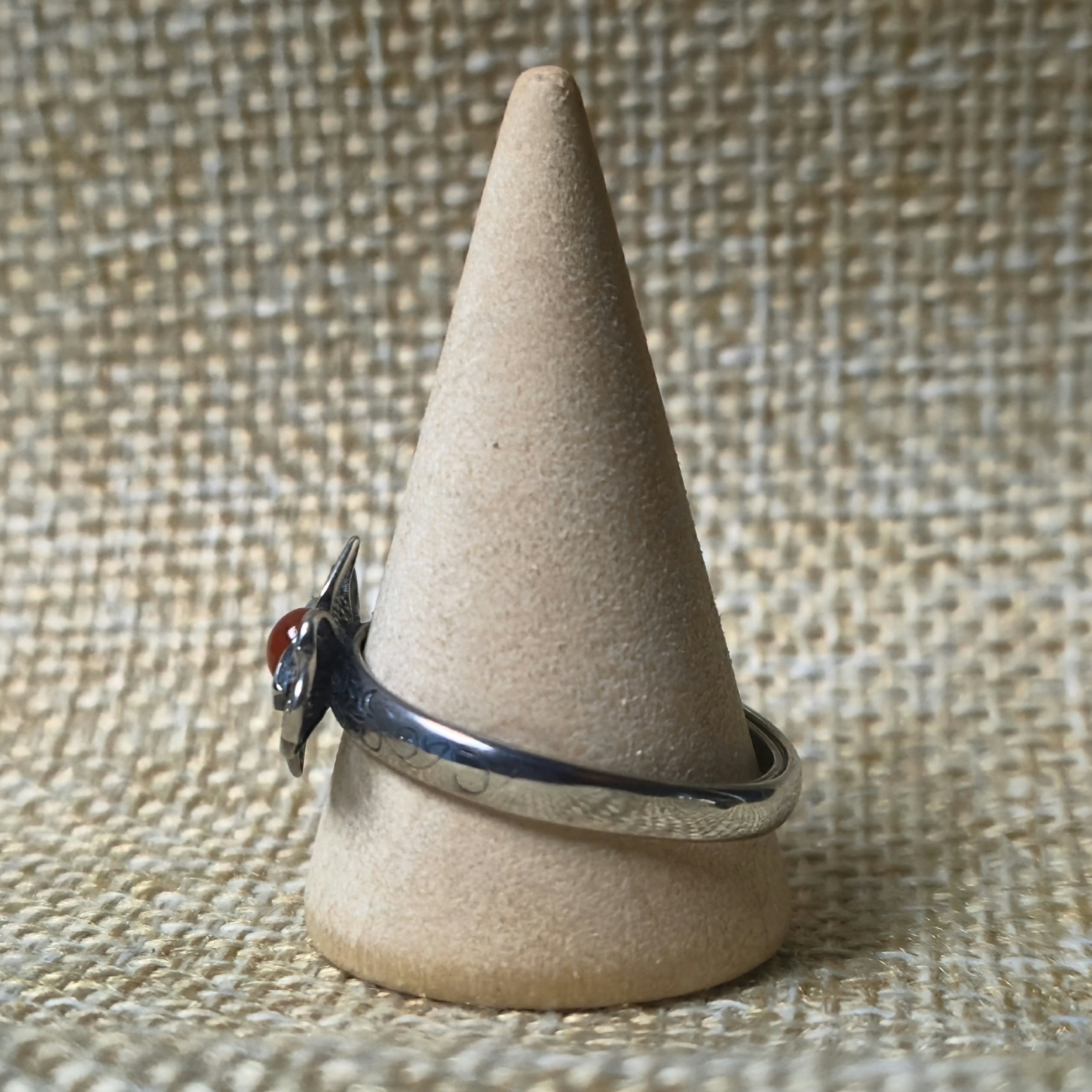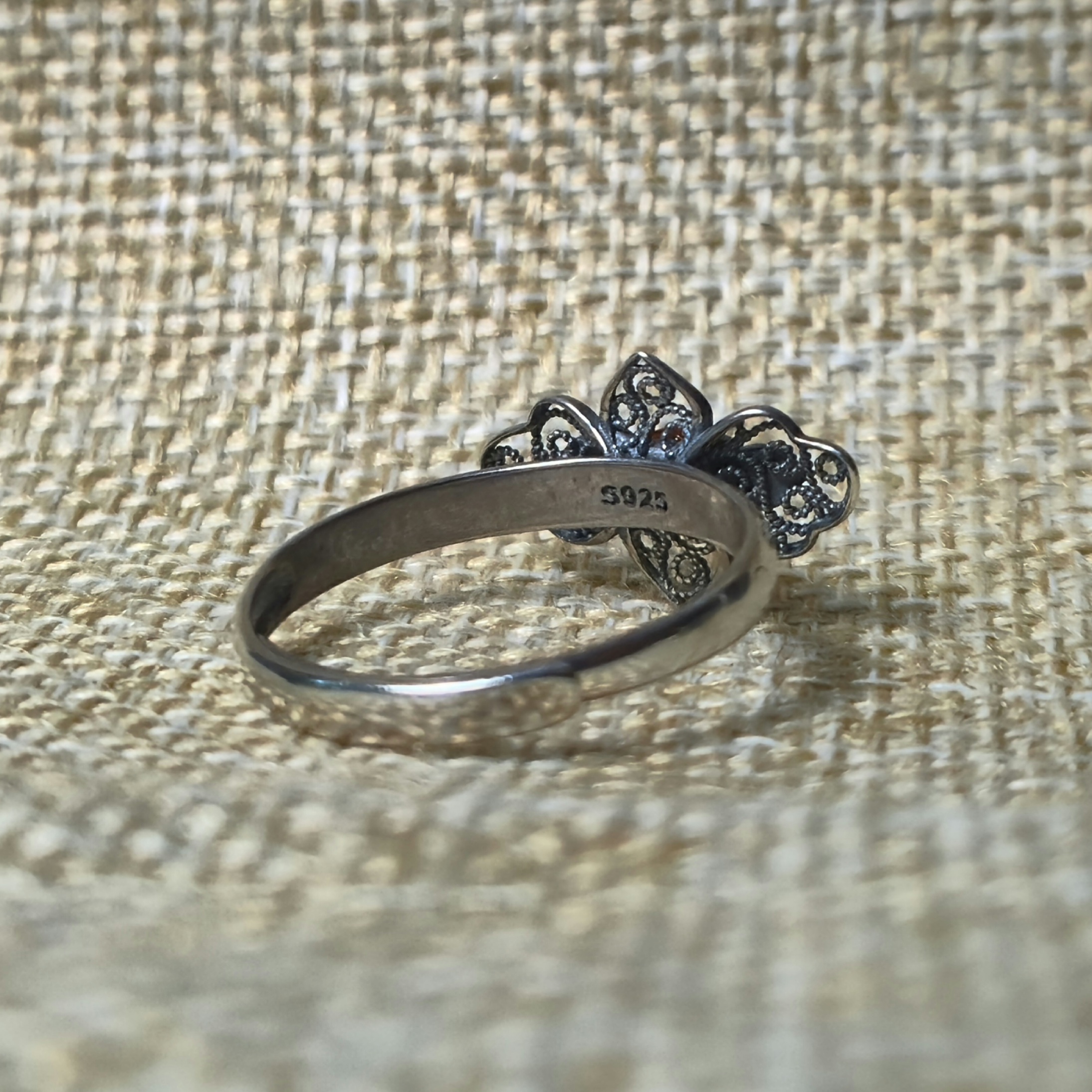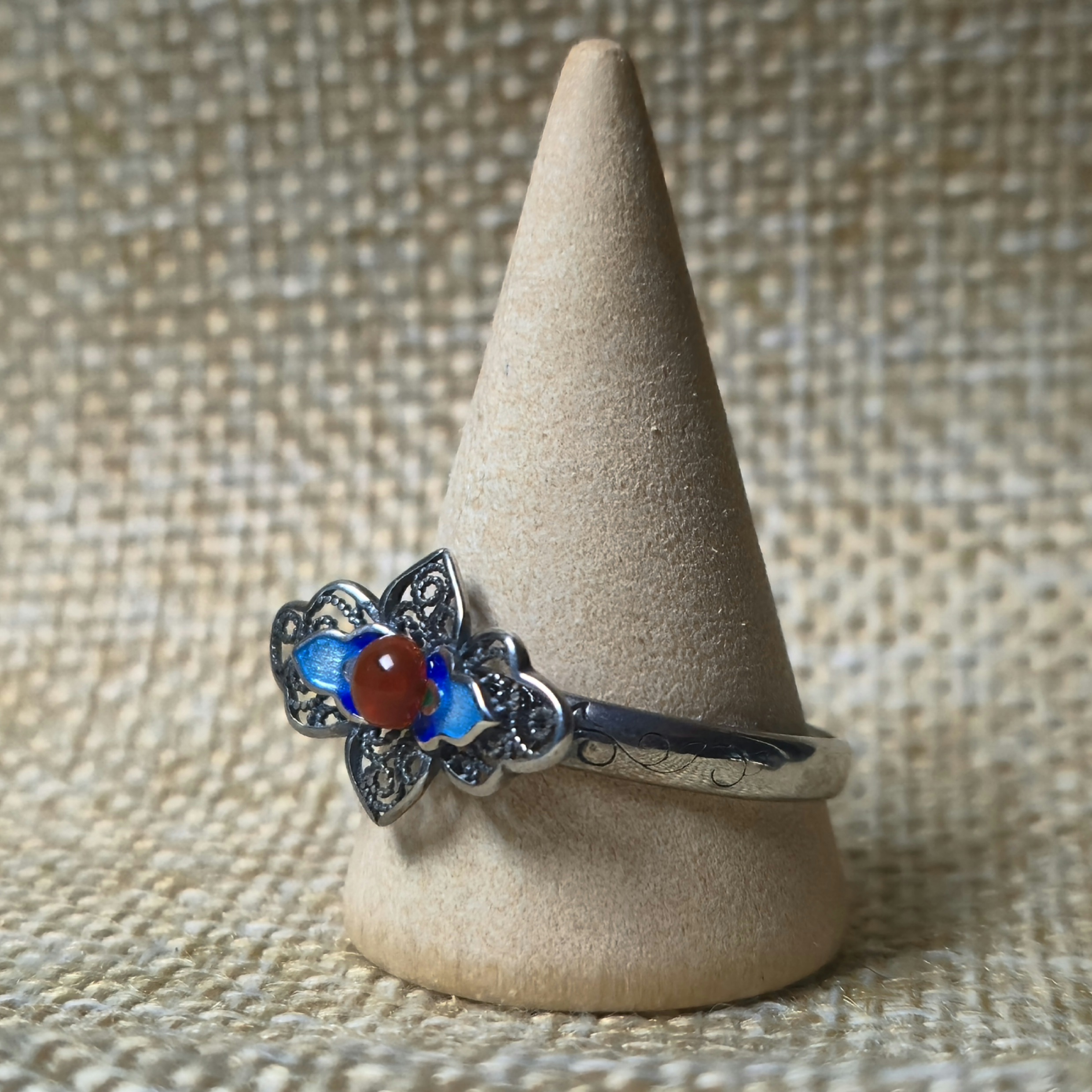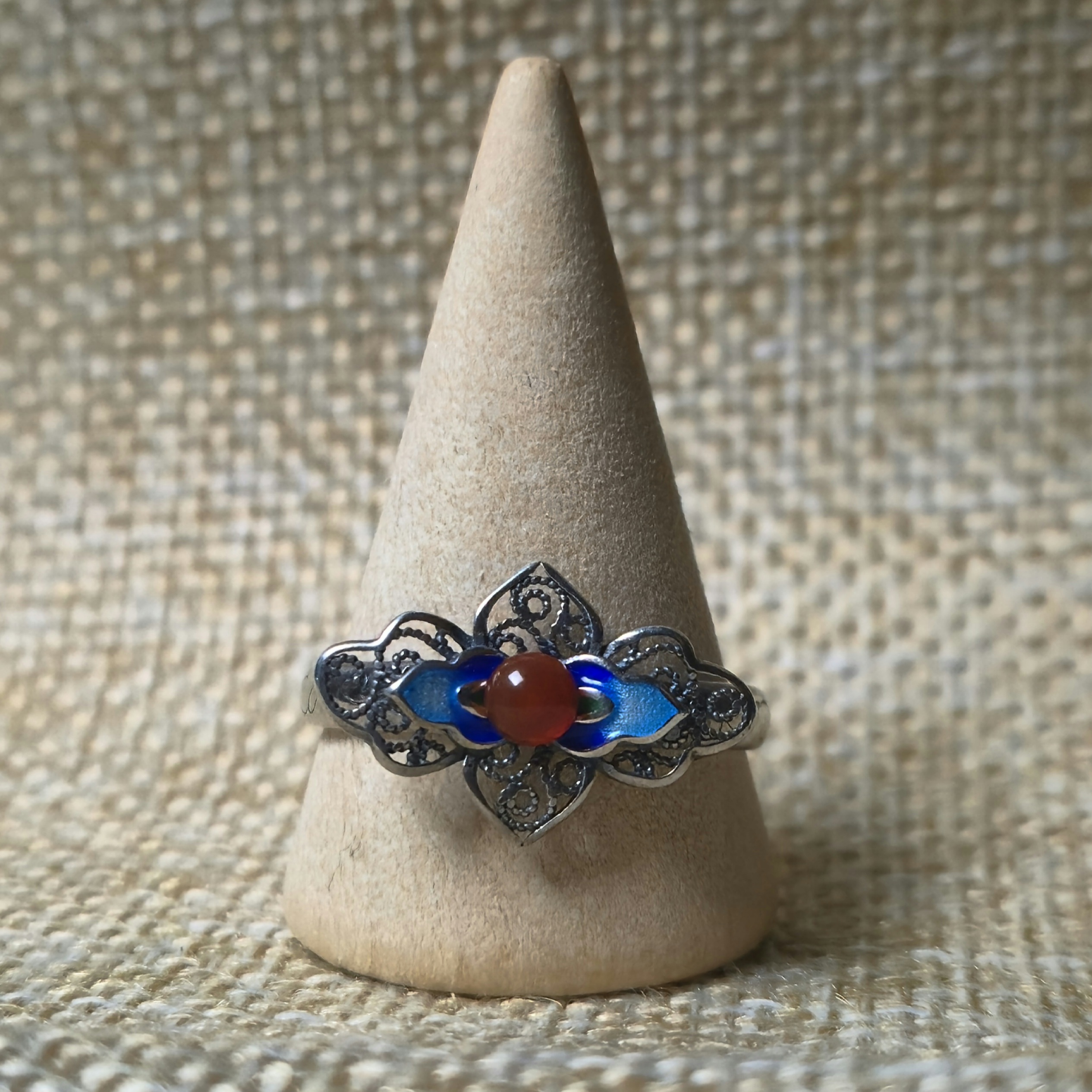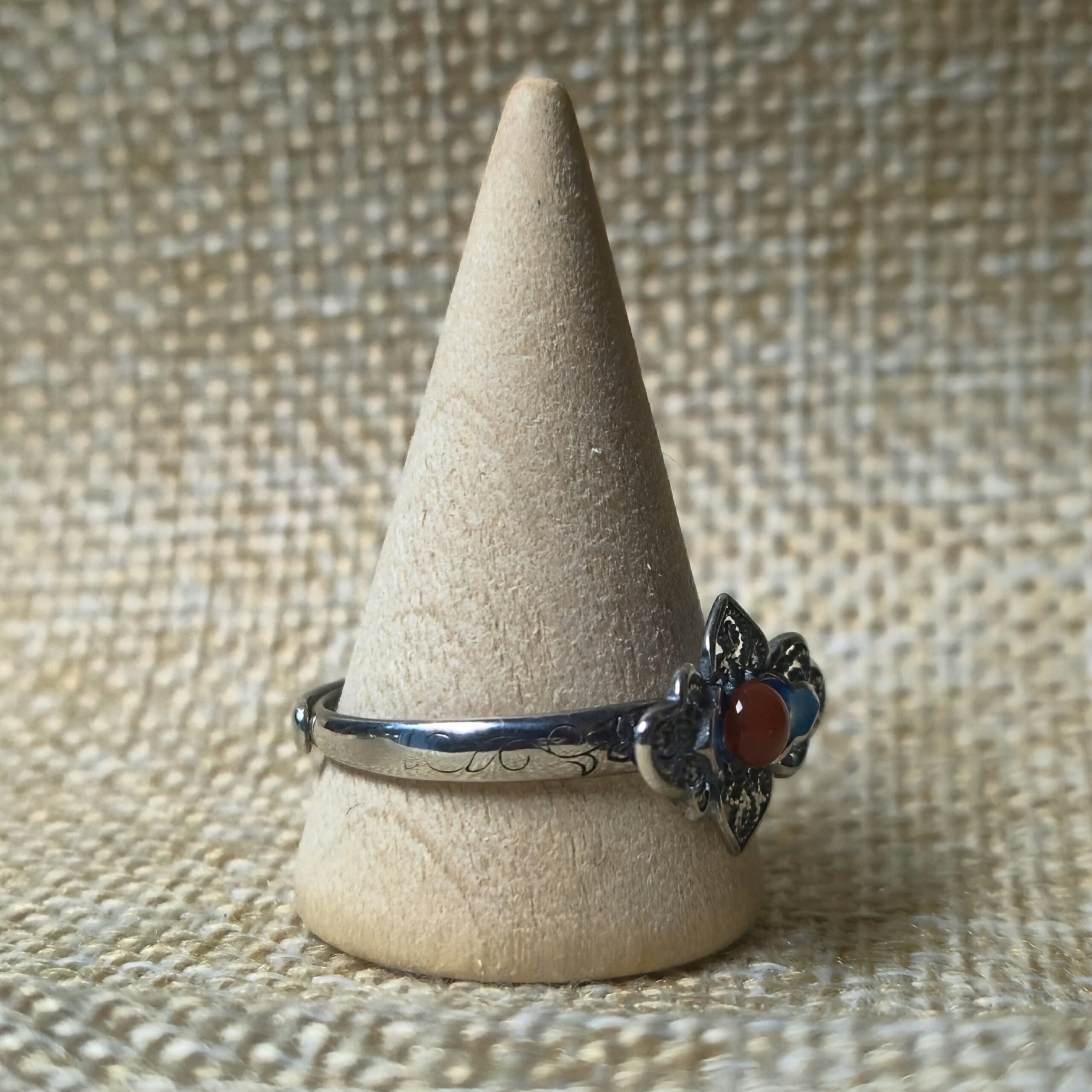 Een emaille bloem met filigraan en een mini granaat. De bloem is 1,8cm breed en 1,2cm hoog. De ring is zilver en in maat verstelbaar.