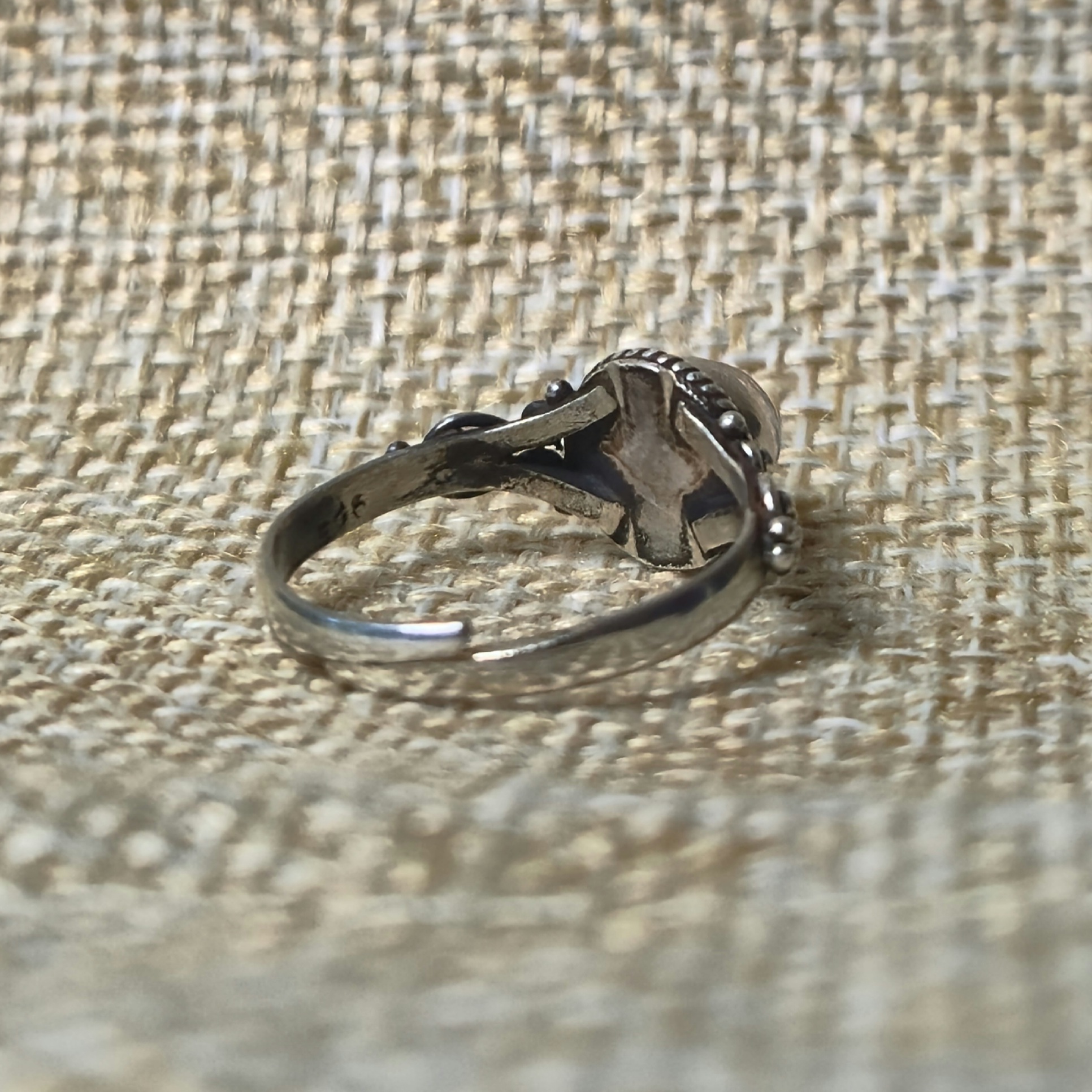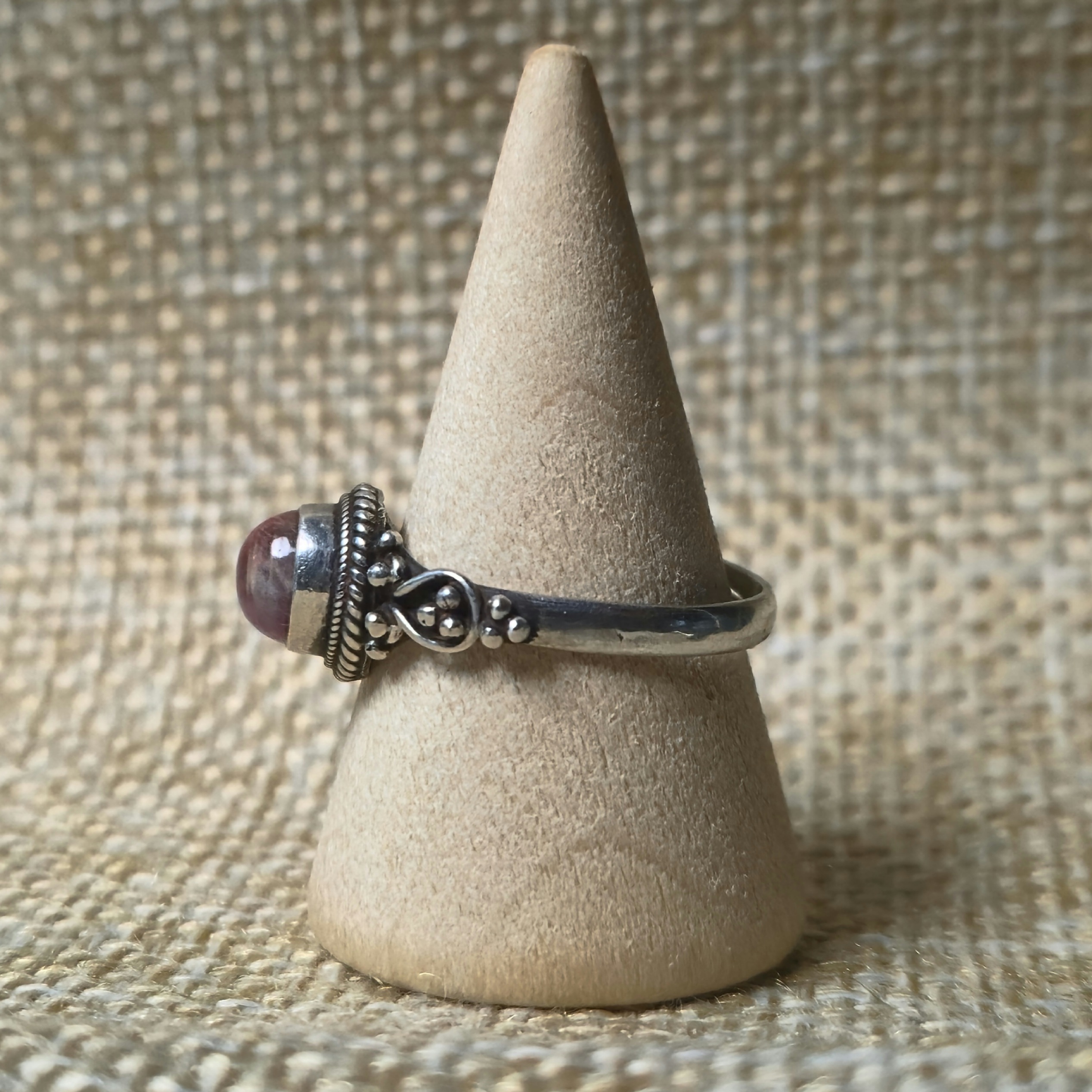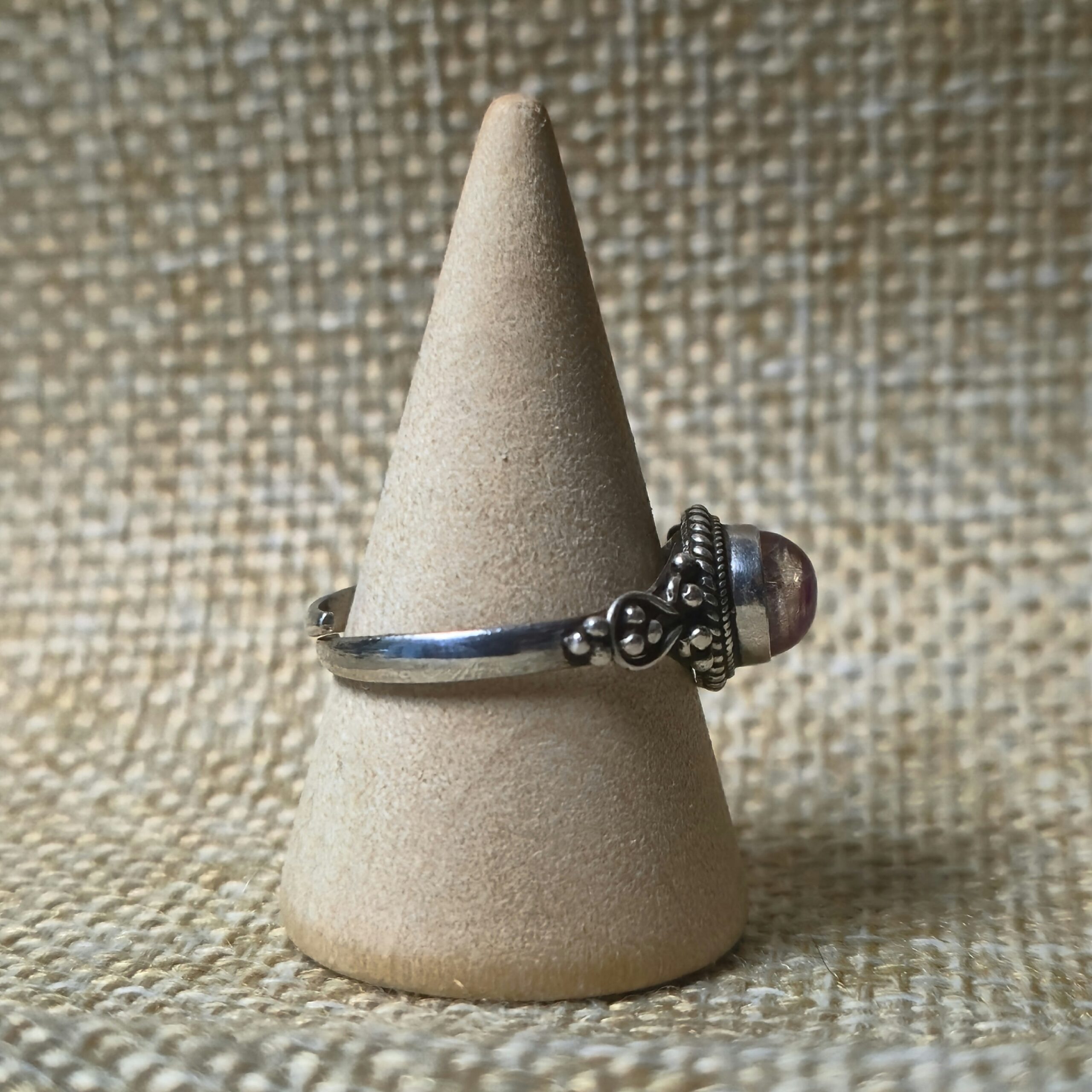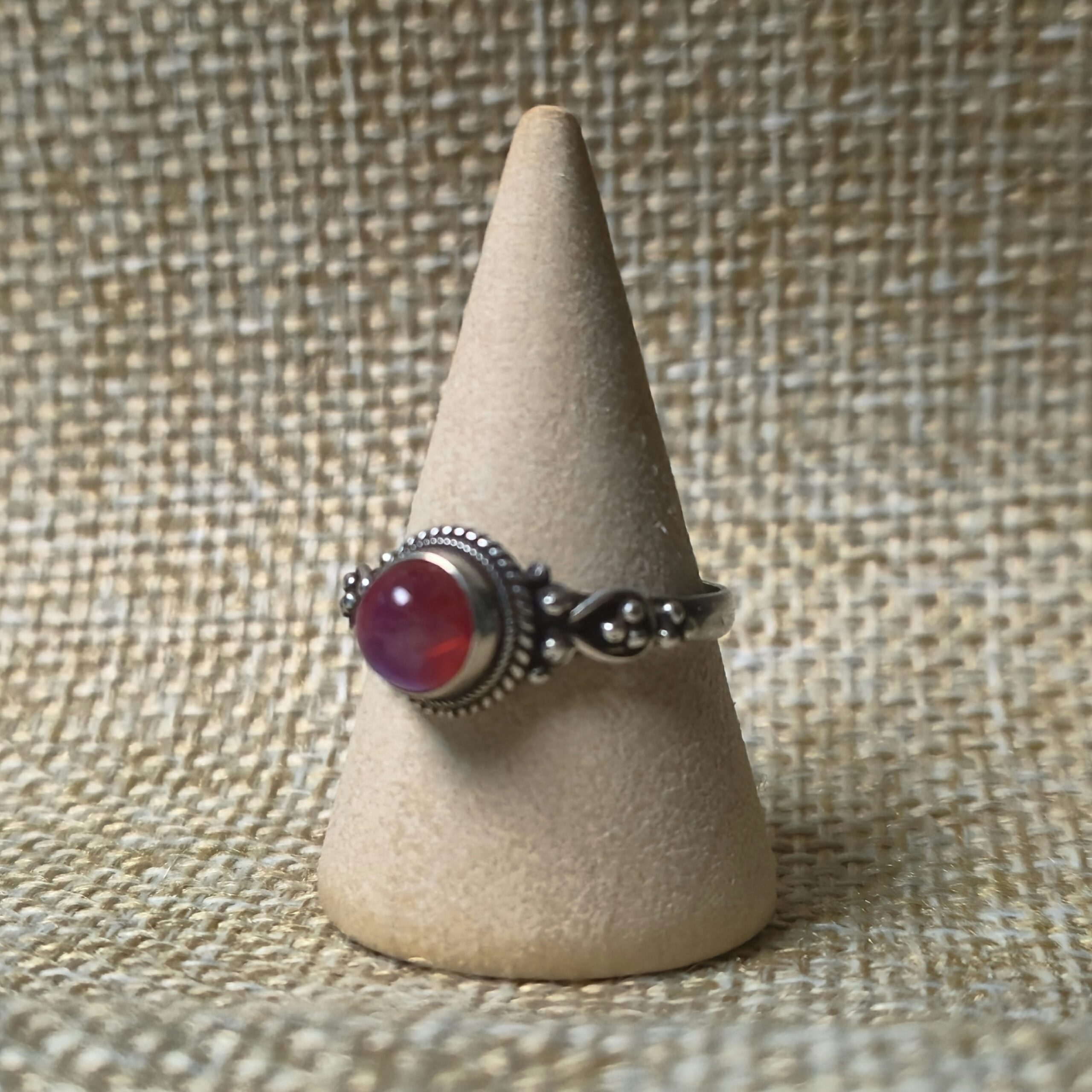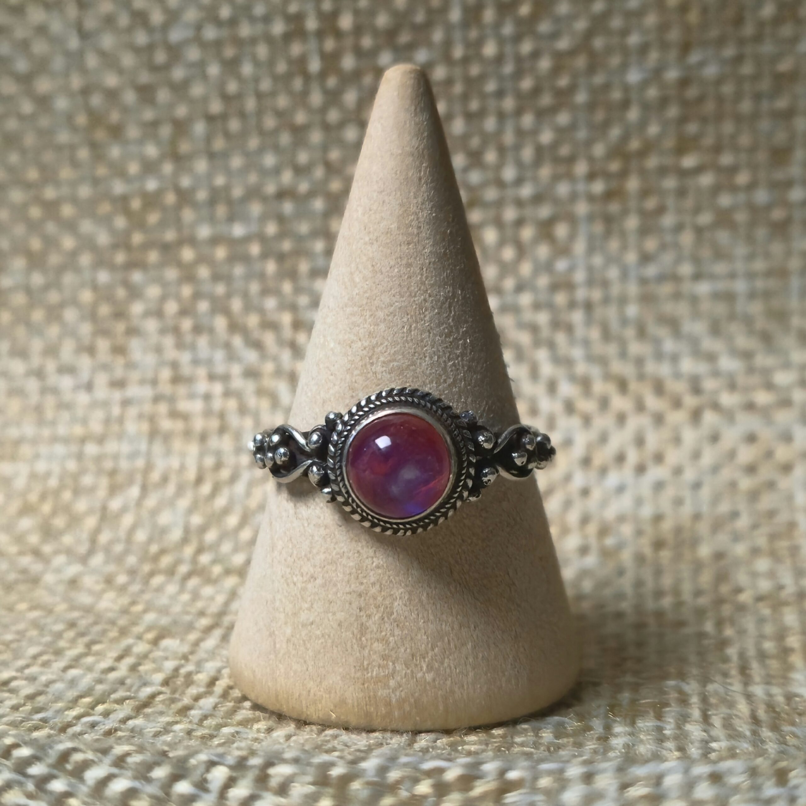 Een klein degelijk handgemaakte roze maansteen. De steen is natuurlijk, de roze kleur niet. De steen kleurt roze door een fluorescerende verflaag tussen de steen en de setting. De steen heeft een diameter van 6mm. De setting is van zilver en verstelbaar in maat.