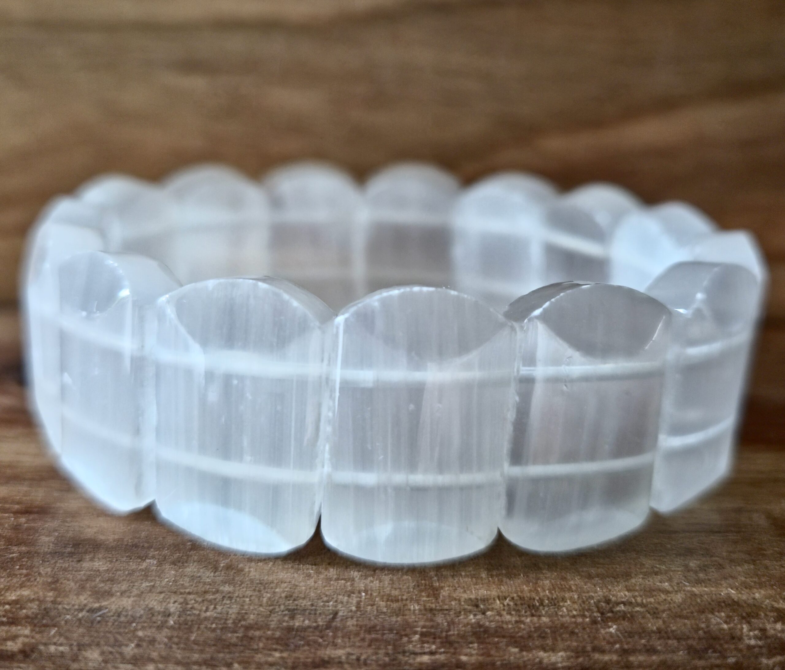 Seleniet elastiek armband. Valt best ruim. De kraal is ongeveer 2,2cm hoog en 1,3mm breed.