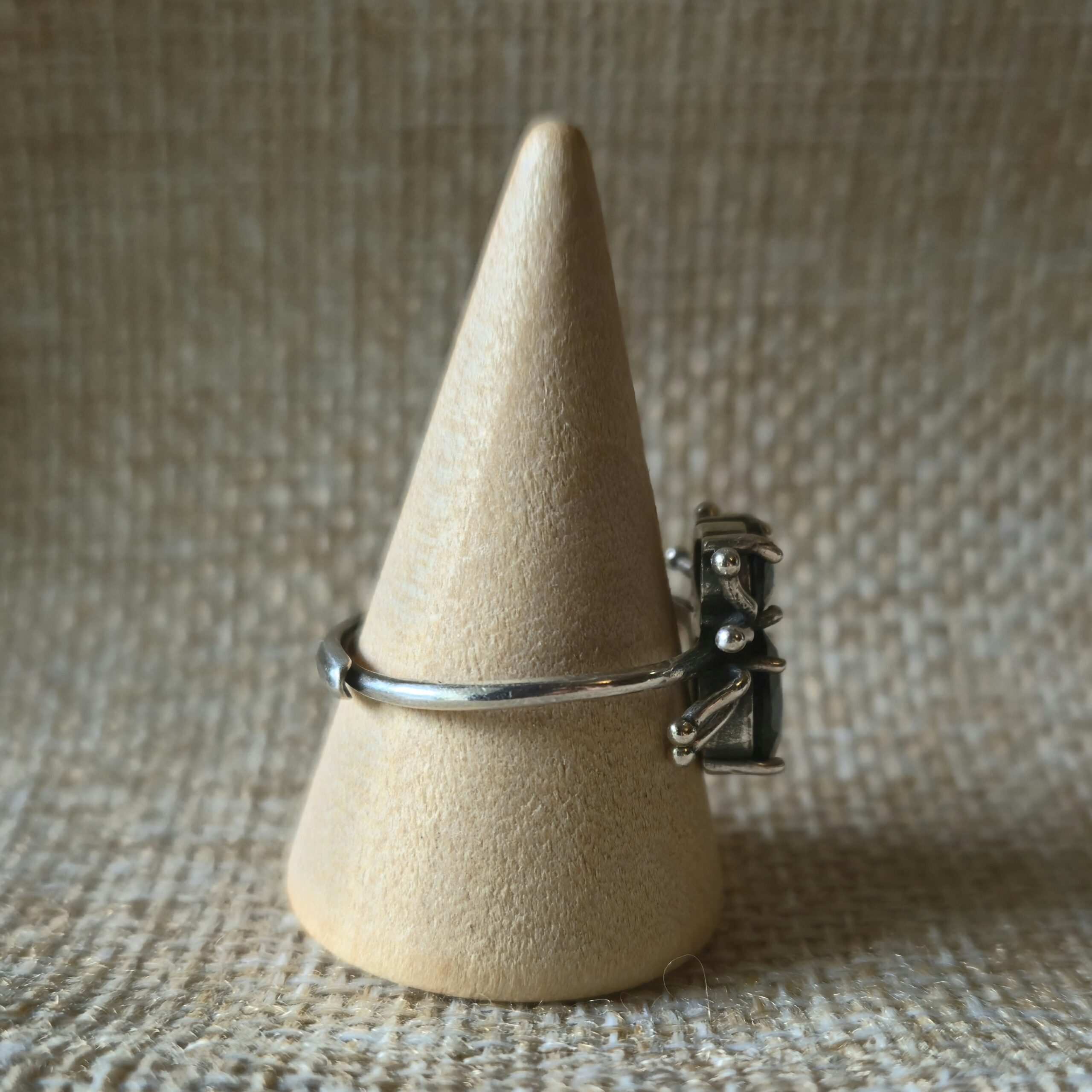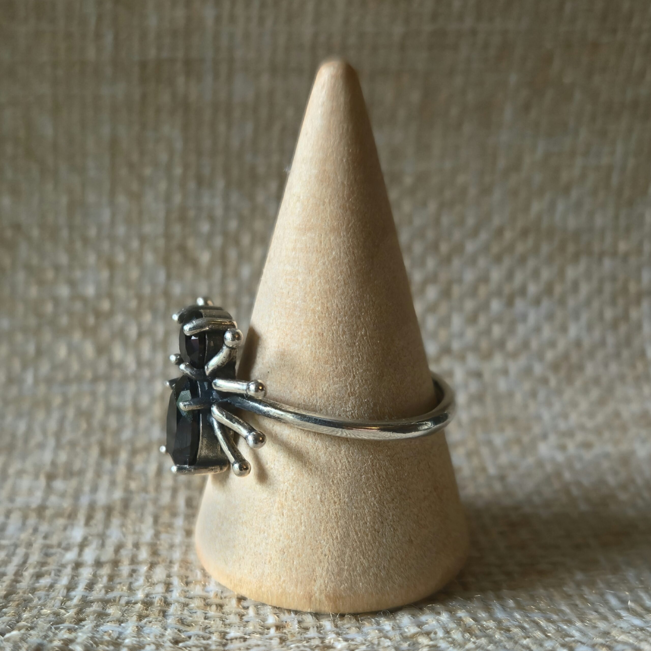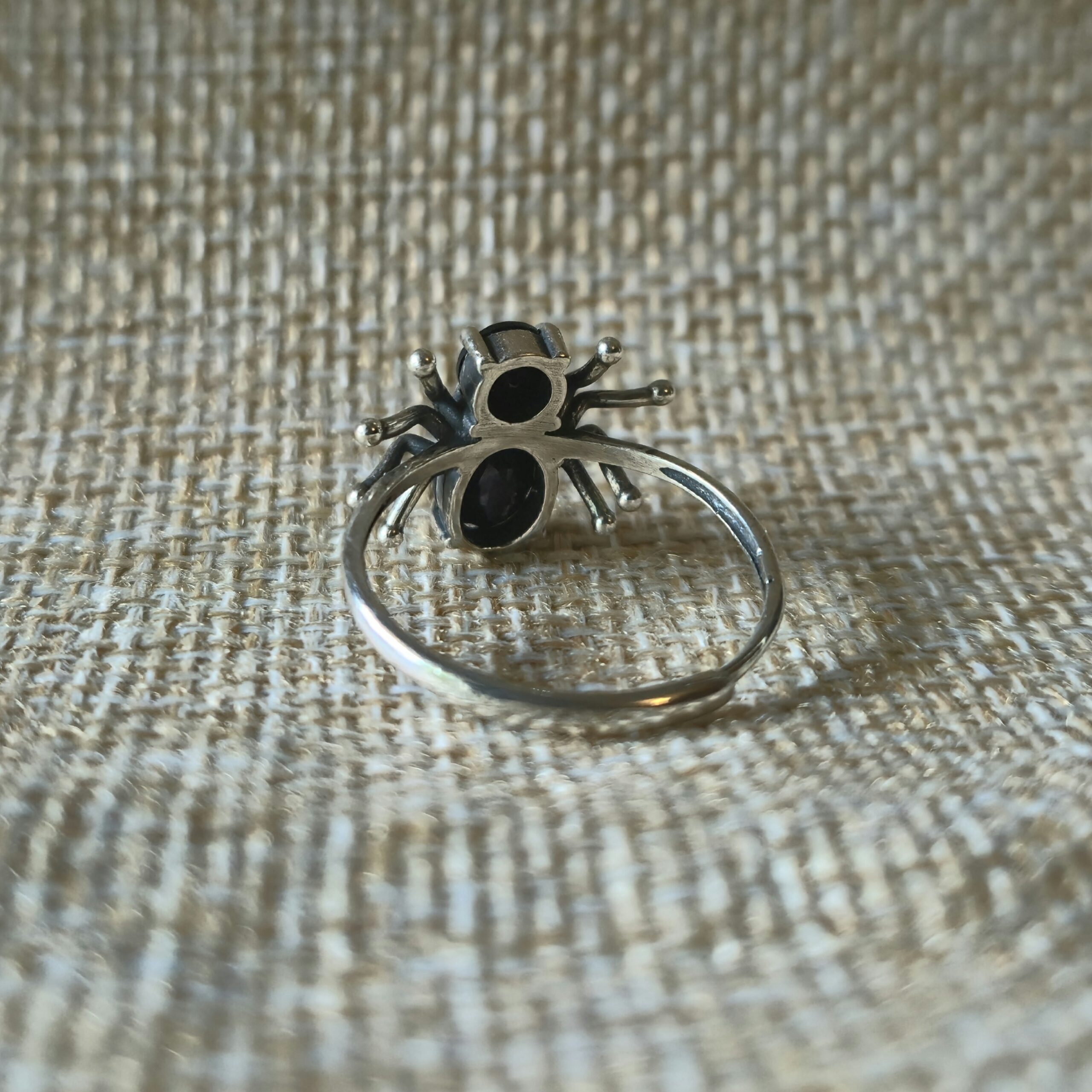 Een leuk spinnetje met facet geslepen zwarte spinel. Het spinnetje is 1,3cm hoog. De ring is van zilver en is verstelbaar in maat.
